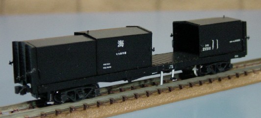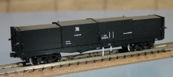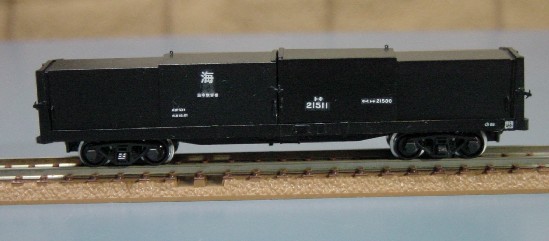| 模型について:新貨車工房製,錦林車庫販売の金属キットです。台車はカトー製TR41を使用します。妻板はホワイトメタル製で、雨水覆いはエッチング板を折り曲げて作ります。 | ||